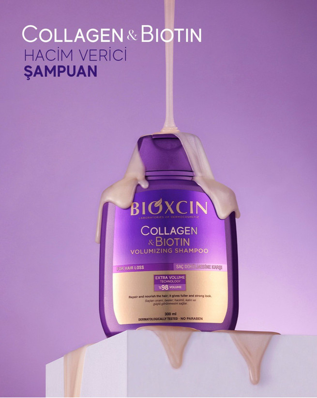 شامپو حجم دهنده کلاژن و بیوتین بیوکسین، موهای نازک، صاف و ضعیف را با کلاژن هیدرولیز شده، بیوتین و پپتیدهای بیو-اکتیو حجم داده و تقویت میکند. این شامپو با داشتن بیوکمپلکس B11 ثبت اختراع شده، به جلوگیری از ریزش مو کمک میکند.